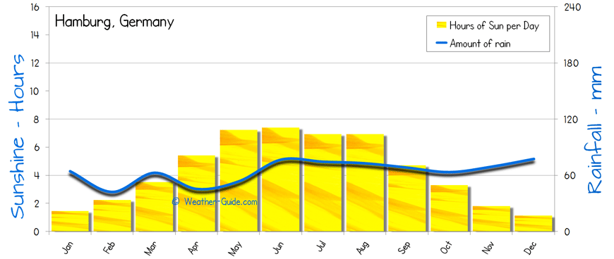 The above weather chart of Hamburg, Germany summarises the monthly averages and season trends.