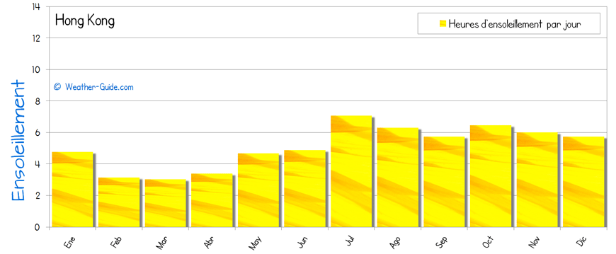 Le nombre moyen d'heures d'ensoleillement par jour pour Hong Kong. La carte météorologique Hong Kong et les données ont été moyennées en segments mensuels pour faciliter le choix d'une saison convenable pour visiter. La température maximale moyenne mensuelle est la température de l'air moyenne qui est dans un endroit à l'ombre, donc les températures rencontrées dans Hong Kong en plein soleil pendant les mois d'été sera beaucoup plus élevé.